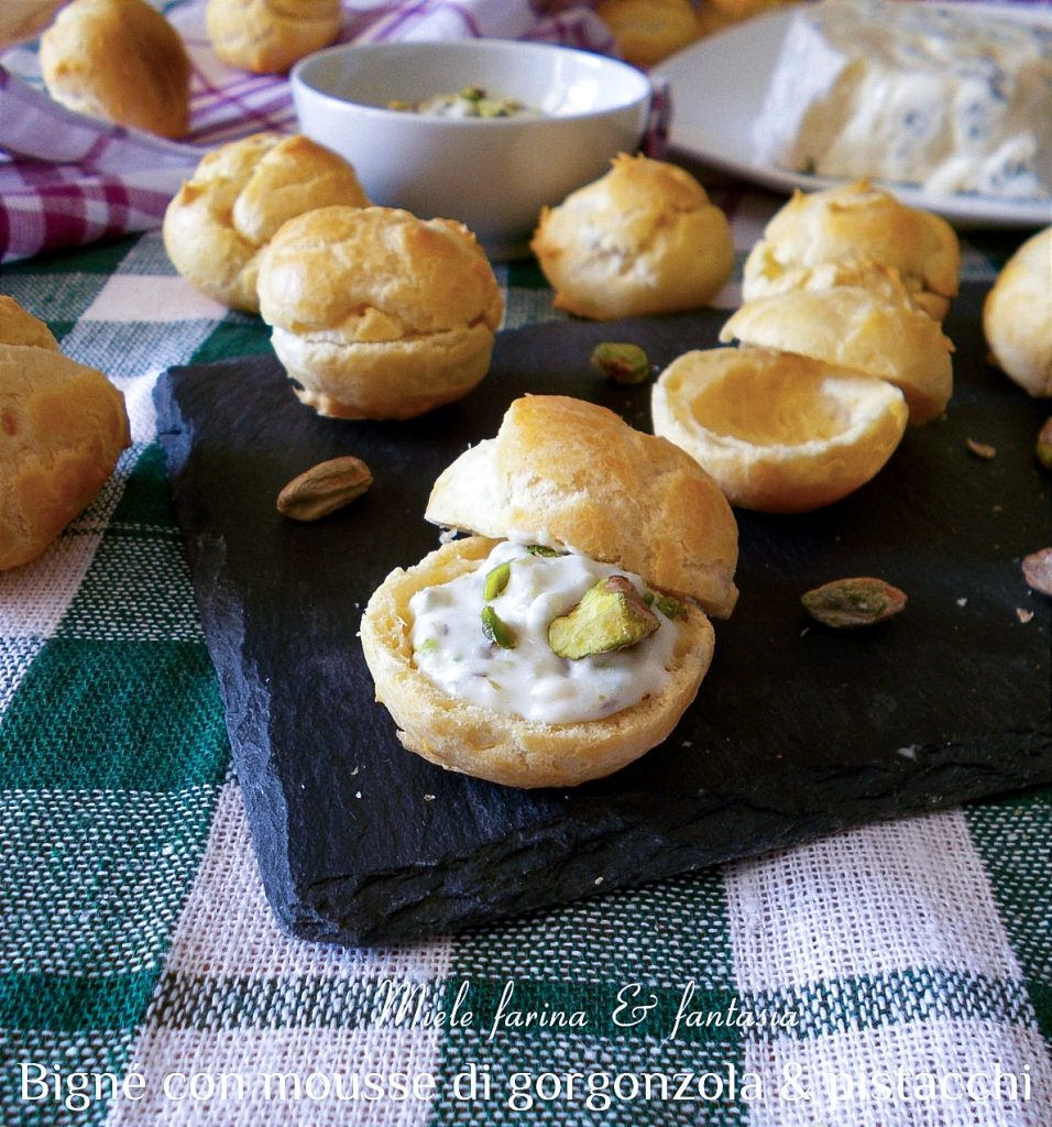 5) Pendant que les choux refroidissent, préparons la mousse de gorgonzola. Mettons le gorgonzola doux dans un grand bol ou dans un mixeur avec des fouets en acier. Ajoutons peu à peu le lait et fouettons jusqu’à obtenir une crème ferme et gonflée, comme une mousse. Enfin, ajoutons les éclats de pistaches et incorporons-les à la mousse.