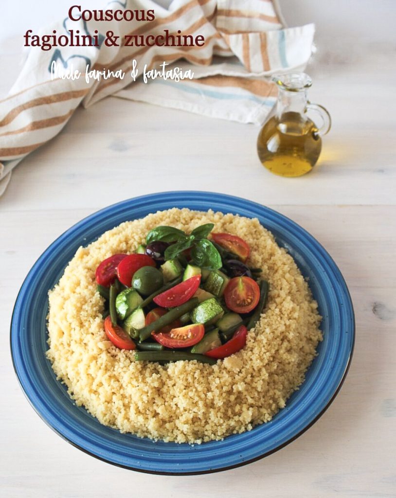 Plat frais et principalement estival, le couscous avec haricots verts et courgettes est un premier plat végétarien très coloré et savoureux, en plus d’être très facile. Il s’agit d’un plat unique à servir froid, idéal pour les pique-niques, sous le parasol ou à emporter au travail. Le couscous avec haricots verts et courgettes peut également être enrichi avec d’autres légumes d’été, tomates cerises, fleurs de courgettes, poivrons, etc…