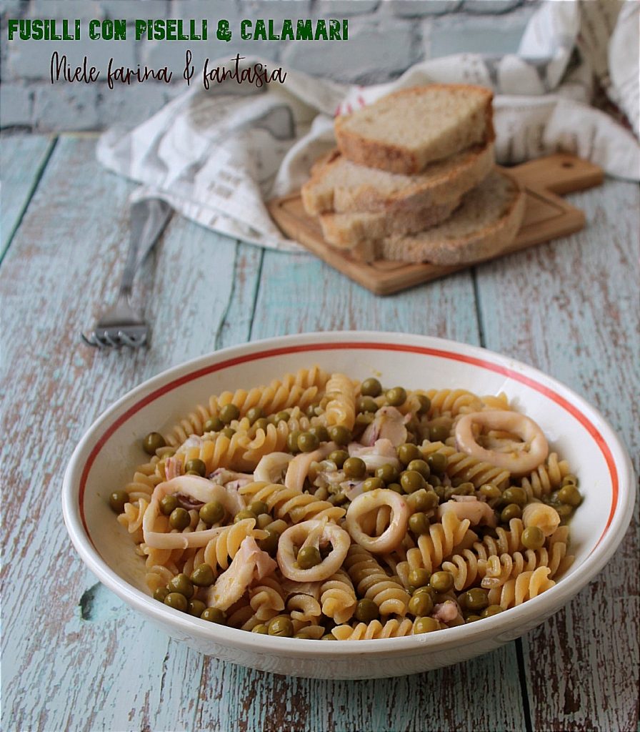 Les fusilli aux calamars et crème de pois sont un plat principal de poisson parfumé et appétissant, très riche et complet. Très facile à préparer, léger et il convient aussi bien pour un repas important que pour le déjeuner du dimanche. Les pois se marient très bien avec la saveur des calamars et le plat résulte très harmonieux dans le goût.