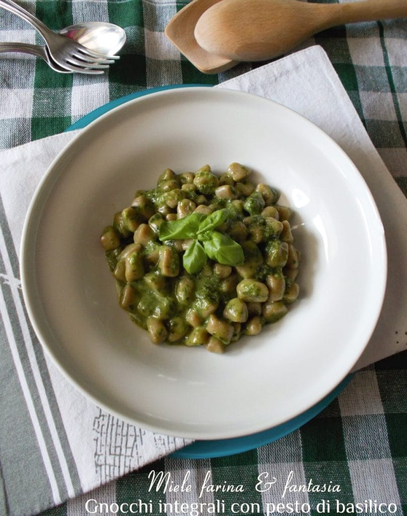 4) Portons de l’eau à ébullition, ajoutons les gnocchis, laissons reprendre l’ébullition, salons et laissons-les cuire pendant 5-6 minutes (même s’ils remontent à la surface presque immédiatement). Goûtons-en un qui devra être parfaitement cuit même à l’intérieur, sans traces de farine ou de pâte crue. Égouttons-les parfaitement et assaisonnons-les avec la sauce choisie. Aujourd’hui, j’ai décidé de les associer à un simple mais savoureux pesto de basilic préparé maison, de manière facile et rapide, pendant que les gnocchis cuisent.