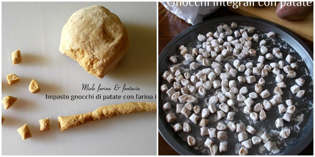 3) Coupons de petits morceaux du pâton et allongeons-les, jusqu’à obtenir des bâtonnets d’environ 20 centimètres à partir desquels nous détacherons de petits gnocchis. Plaçons les gnocchis complets sur un plateau légèrement fariné avec de la semoule de blé dur ou de la farine 00 et laissons-les reposer pendant environ 30 minutes. Pendant ce laps de temps, le gluten se détendra et nos gnocchis resteront tendres à la cuisson.