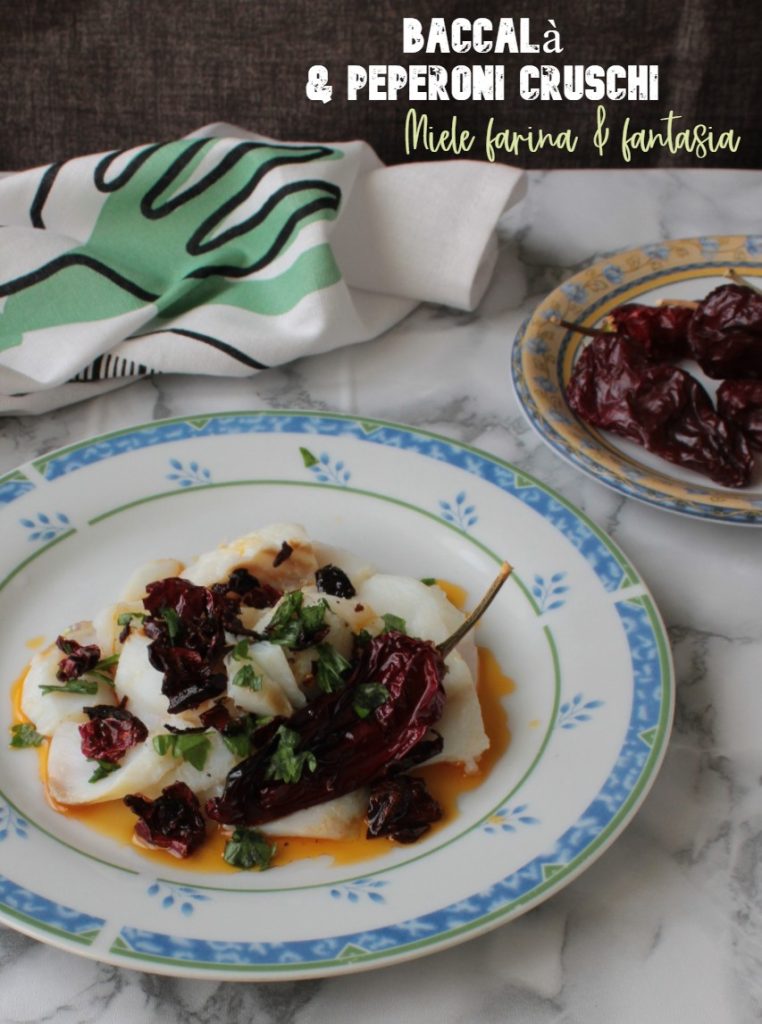 La morue et poivrons cruschi (ou « morue à la trainera » ou morue à la potentina) est un savoureux plat de poisson très facile et rapide à réaliser, une vraie délice. Les poivrons cruschi, si vous ne les connaissez pas ou ne les avez jamais goûtés, sont des poivrons croustillants (cruschi, justement), appartenant à la tradition gastronomique lucanienne (mais on les retrouve aussi dans la cuisine calabraise), reconnus comme PAT, c’est-à-dire « produit agroalimentaire traditionnel ». Il s’agit d’une variété de poivrons au goût doux, de couleur rouge intense, à la chair fine et à faible teneur en eau. Toutes ces caractéristiques, notamment les deux dernières, les rendent parfaits pour le séchage. Les « couronnes » de poivrons séchés se montrent fièrement sur les balcons ou dans les magasins d’alimentation, de fruits et légumes, et quand je vais en Basilicate, je ne reviens jamais sans l’une de ces délices (ce n’est pas la seule, d’ailleurs). J’ai mangé la morue et poivrons cruschi plusieurs fois sur place et aujourd’hui, je voulais la reproduire chez moi, car c’est une de ces recettes simples qui cachent en réalité une saveur et un parfum qui mettent immédiatement l’eau à la bouche.