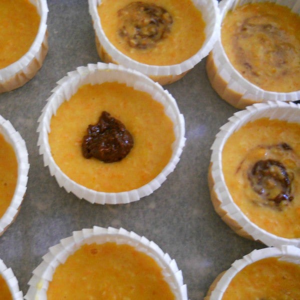 Maintenant, créer le cœur de cacao, en utilisant une petite cuillère, prélever un peu de pâte au cacao de la taille d’une noisette et l’appuyer sur la pâte orange. Continuer jusqu’à remplir tous les muffins.
