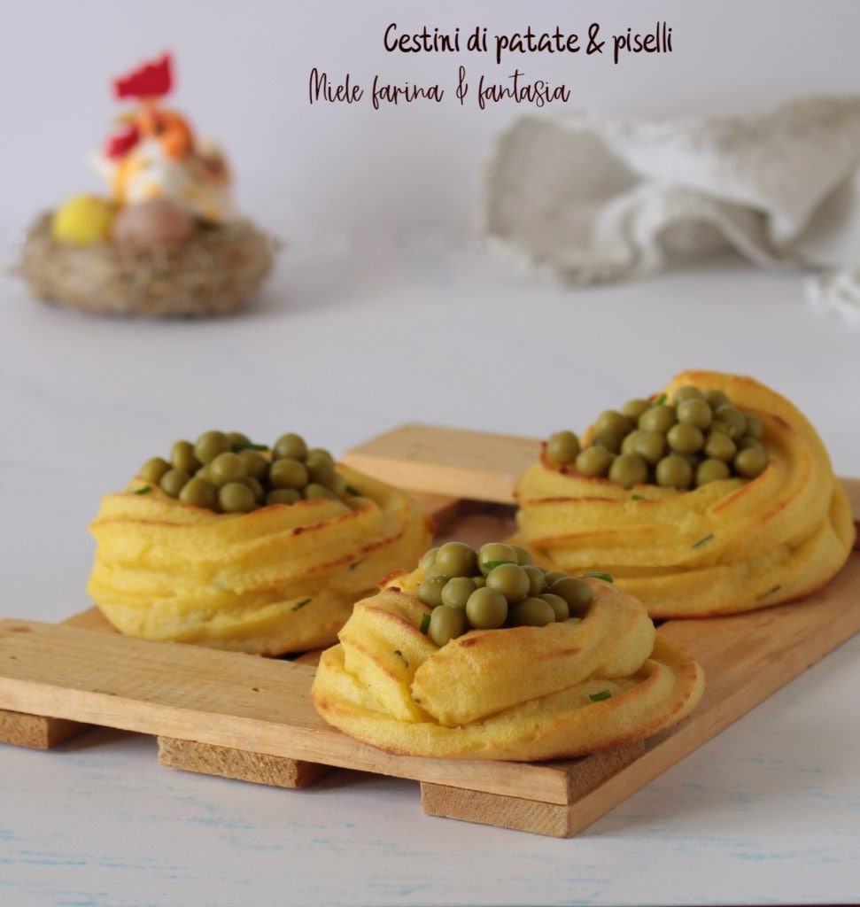 Les paniers de pommes de terre farcis de petits pois sont de délicieux et esthétiques amuse-gueules à servir froids. Ils sont idéaux pour impressionner les invités avec un plat très chic, savoureux, sans gluten et très facile à réaliser. Les paniers de pommes de terre peuvent également être proposés comme accompagnement ou plat principal végétarien. Ils peuvent être préparés à l’avance et garnis au besoin, avec tout ce que l’imagination nous suggère, c’est-à-dire avec des champignons, de la saucisse, des poivrons, de la viande hachée, des mélanges de légumes, etc. Ils sont parfaits pour remplacer les fameux vol-au-vent.