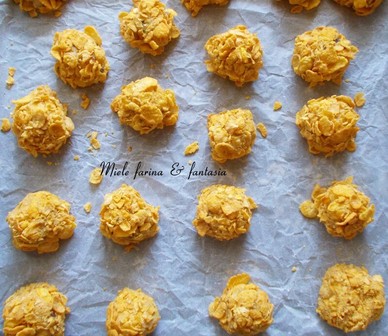 Tapisser une plaque de papier sulfurisé; à l’aide de 2 cuillères à café, prélevez une noix de pâte de forme plus ou moins ronde et passez-la dans les corn flakes.