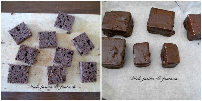 10) Plaçons les petits gâteaux sur une grille posée, à son tour, sur un saladier. Espacer les petits gâteaux d’un doigt l’un de l’autre, versez le glaçage au chocolat sur les petits gâteaux, laissant l’excédent tomber dans le saladier en dessous. Laissez sécher le glaçage pendant au moins une heure. Maintenant, les petits gâteaux sont prêts à être dégustés. Complétez les petits gâteaux en les décorant avec des zestes d’orange confits, dont le procédé très facile est disponible au lien ci-dessous.