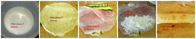 Disposez sur chaque crêpe des tranches de courgettes grillées pour couvrir toute la surface de la crêpe. Continuez avec une tranche de jambon cuit et une grosse noix de robiola aromatisée que vous étalerez uniquement sur la moitié de la crêpe. Roulez-la comme un cannelloni, en gardant la fermeture vers le bas et coupez les rondelles avec un couteau bien aiguisé. Disposez les rondelles dans un plat, avec du papier sulfurisé et passez-les sous le grill pendant 5 minutes. Elles sont prêtes à être dégustées.