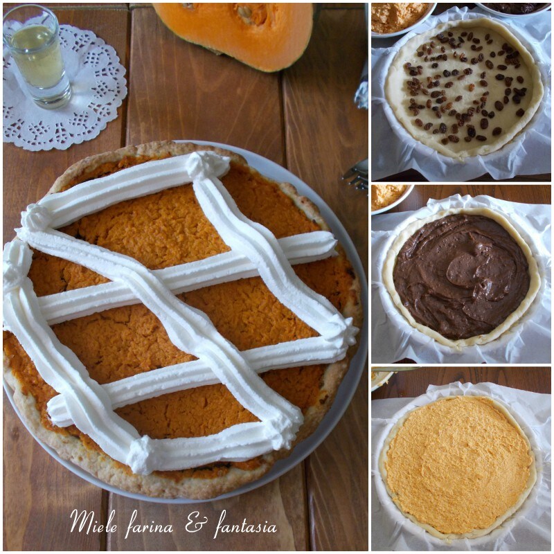 Allumons le four à 180*. Égalisons les bords de la pâte sablée, distribuons au fond les raisins secs bien égouttés de la liqueur, ajoutons la crème au chocolat et nivelons-la; ensuite, ajoutons également la crème de citrouille, nivelons-la avec le dos d’une cuillère et enfournons sur la grille centrale pendant environ 60 minutes si nous utilisons un four avec cuisson uniquement par le bas; sinon, le temps de cuisson est réduit à environ 45 minutes dans un four avec cuisson en haut et en bas. Le dessert est prêt lorsque même le bord supérieur de la tarte sera bien doré. Éteignons et sortons la tarte du four, sans toucher la crème (qui sera encore très molle) ni la pâte sablée. Laissons-la refroidir complètement, puis nous pourrons la décorer avec des touffes de crème fouettée ou comme notre imagination nous le suggère.