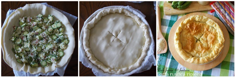5) Déroulons un rouleau de pâte feuilletée et posons-le bien dans un moule à tarte recouvert de papier sulfurisé. Garnissons avec la farce et recouvrons avec l’autre rouleau, fermant parfaitement les extrémités, en enroulant ensemble les bords des deux pâtes, jusqu’à former un cordon ; faisons un petit trou dans la pâte feuilletée pour permettre à la vapeur excessive de s’échapper pendant la cuisson.