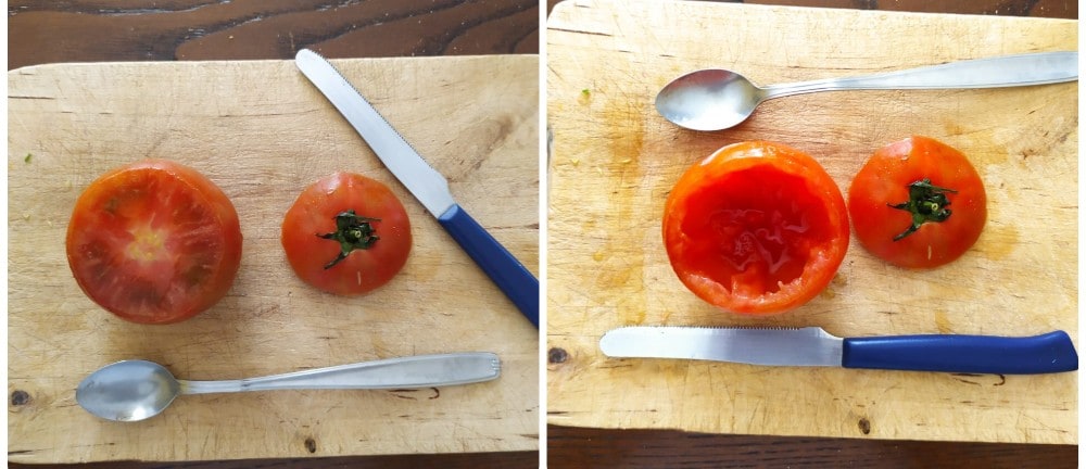 3) Lavons les tomates, coupons le chapeau et, avec une cuillère, creusons et éliminons la pulpe. Salez l’intérieur vide et placez-les à l’envers pour éliminer l’excès de leur liquide de végétation (une demi-heure est plus que suffisante).