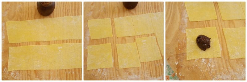 3) Au centre de chaque carré, mettez une noix de confiture de marrons au cacao, humidifiez les bords avec très peu d’eau (cela fera office de colle), joignez deux coins opposés, formant un triangle, fermez-les bien avec les dents d’une fourchette.