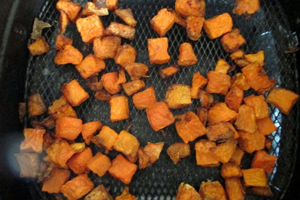 Coupe le potiron en cubes et mets-le directement dans le panier de la friteuse à air. Fais rôtir le potiron à 170°C pendant environ 30 minutes.