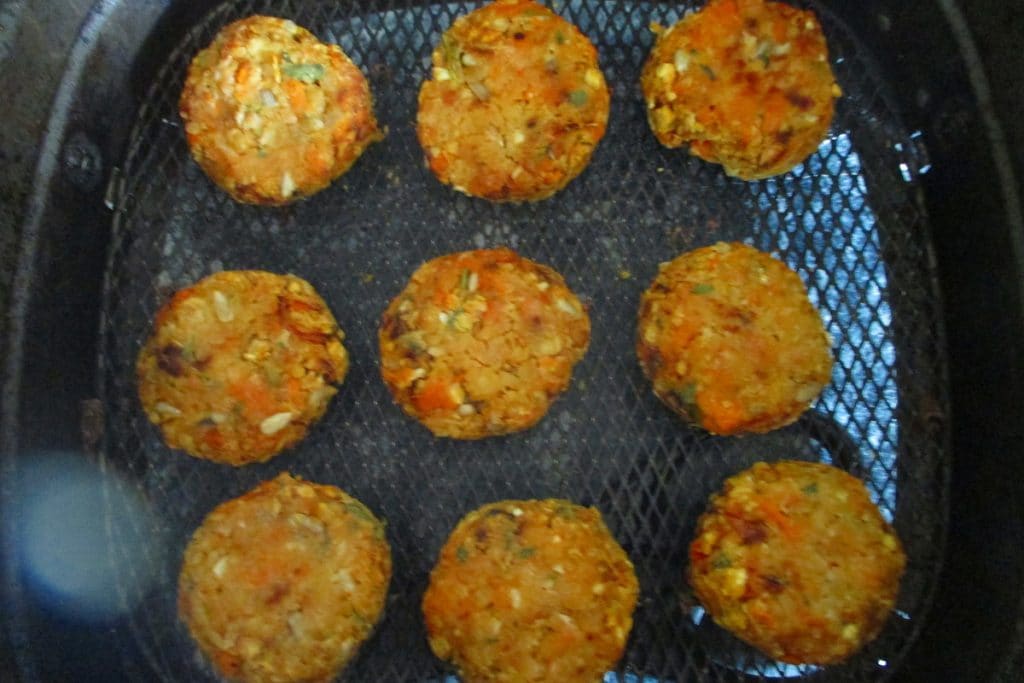 Commence par faire cuire les boulettes à 170°C pendant 8 minutes, sors le panier et retourne les boulettes mais cette fois il n’est plus nécessaire d’utiliser le papier : retourne-les et mets-les directement sur le panier. Fais-les cuire encore 7 minutes ou plus jusqu’à ce qu’elles soient bien dorées.