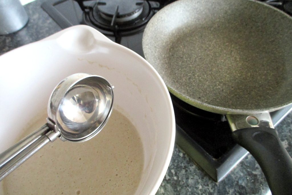 Laisse reposer la pâte pendant que la poêle antiadhésive chauffe : il est préférable d’utiliser une poêle en pierre ou en tout cas antiadhésive pour ne pas avoir besoin même d’une goutte d’huile. J’utilise une poêle de 20 cm, je t’ai laissé un conseil dans la section Outils en haut. Si tu n’as pas de poêle appropriée, utilise la meilleure que tu as, mesure une demi-cuillère à café d’huile à part et badigeonne-la avant de verser la pâte. Habituellement, les deux premiers pancakes posent problème puis ils ne colleront plus.