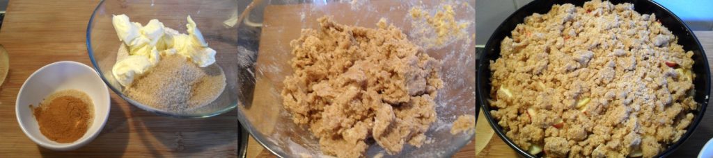• Pèse le reste des ingrédients séparément pour le crumble et pour le topping. Travaillez avec les bouts des doigts, les quantités indiquées de farine, sucre et margarine pour former le crumble. Le mélange obtenu ne sera pas lisse, il doit rester sablé. Répartis le crumble sur toute la surface du gâteau uniformément.
