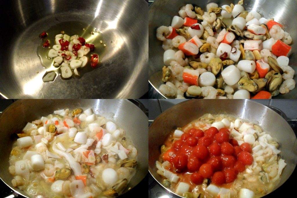 Ajoute les fruits de mer bien égouttés, fais-les revenir une ou deux minutes puis fais cuire à feu moyen pendant environ 5 minutes.
