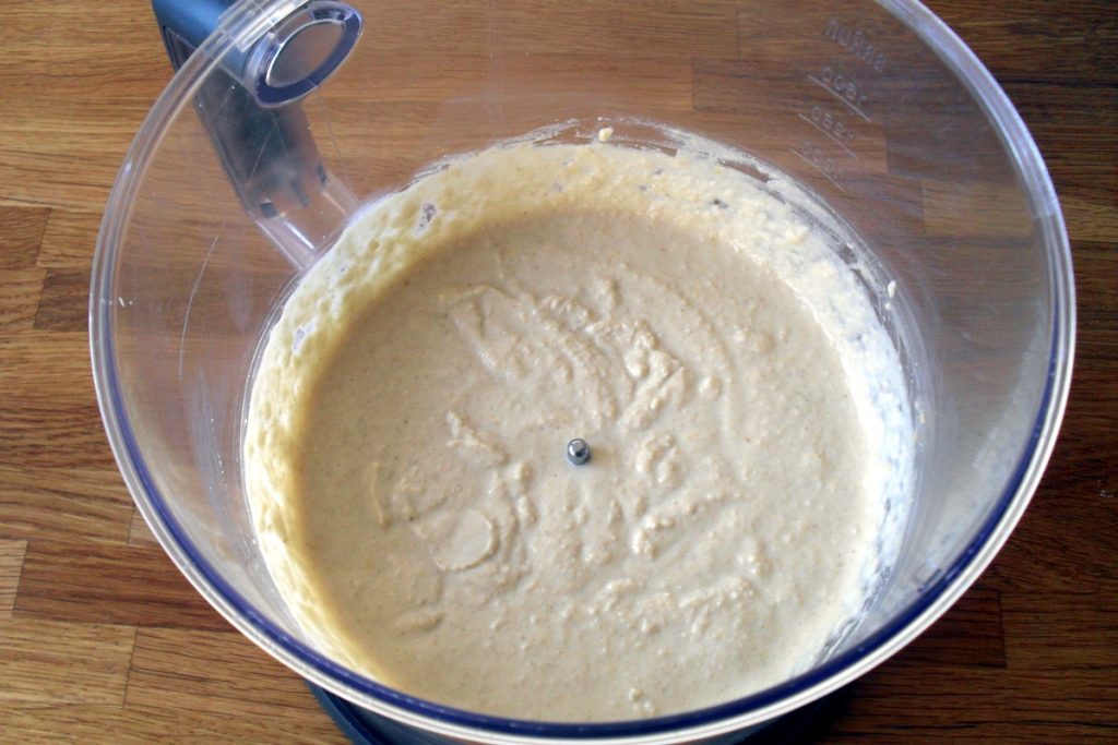 Mixez avec un mixeur plongeant tous les ingrédients de l’houmous : pois chiches, tahini, le jus et le zeste râpé de la moitié d’un citron, l’ail en poudre ou entier et un peu de sel. Vous devez obtenir une crème et s’il reste des petits morceaux, ce n’est pas grave, cela dépend beaucoup de la puissance de votre mixeur. Goûtez pour ajuster le sel et si nécessaire, ajoutez-en encore.