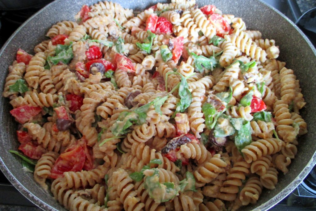 Et voilà, notre pâtes avec houmous de pois chiches est prête à être servie ! C’est aussi un beau plat coloré à apporter à table non ?