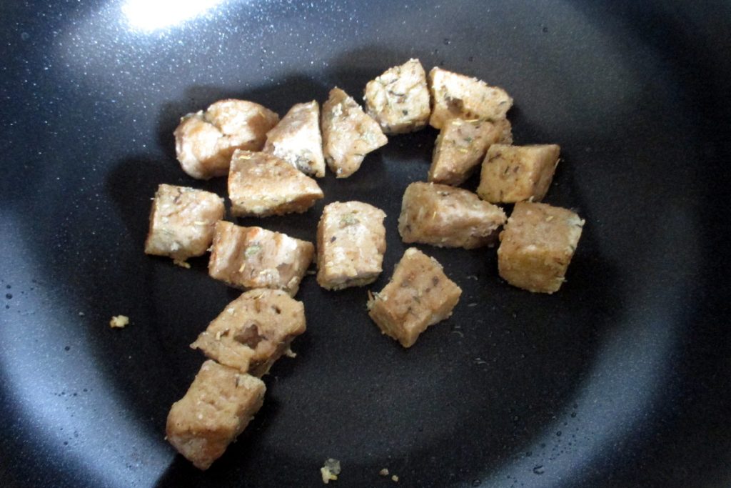 Fais chauffer 1 cuillère à café d’huile dans une casserole et fais revenir le seitan pendant quelques minutes de tous les côtés.