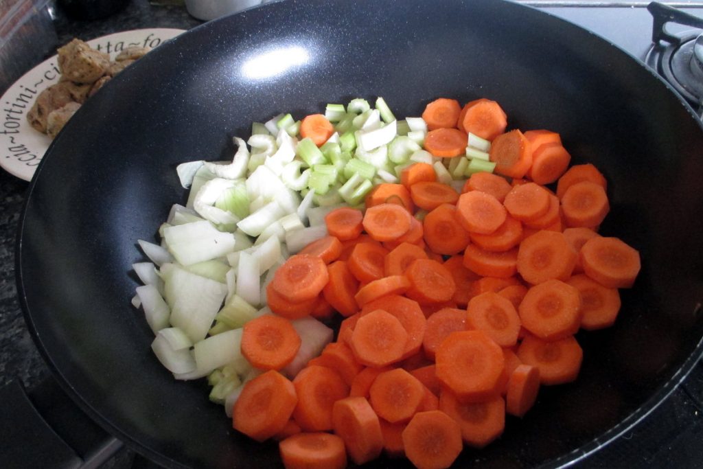 Retire le seitan de la casserole et pour l’instant, mets-le de côté. Ajoute une autre cuillère d’huile et fais revenir l’oignon, les carottes et le céleri en ajoutant un peu d’eau ou de bouillon si cela sèche trop.