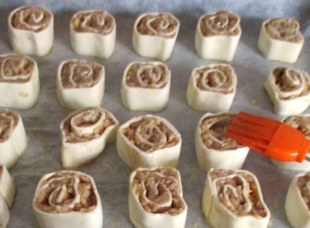 Dispose les roulés sur une plaque recouverte de papier sulfurisé et badigeonne de lait végétal le dessus et les bords de tous les roulés.