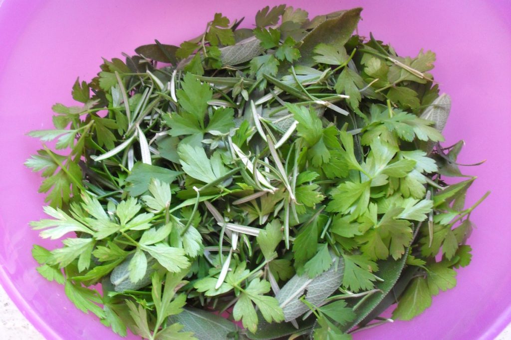 Les herbes que vous choisissez doivent être divisées en parts égales. J’ai utilisé du romarin, du thym, de la sauge et du persil. Vous pouvez utiliser plus ou moins de sel et d’autres herbes fraîches mais rappelez-vous que la proportion d’herbes et de sel à utiliser est de 1:10.