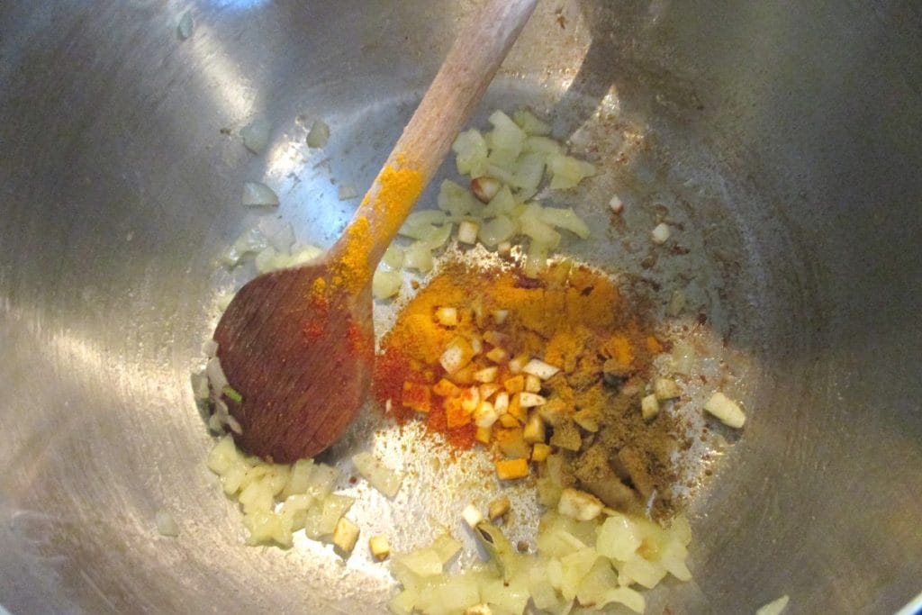 Fais légèrement revenir l’ail et l’oignon coupés en morceaux dans la cuillère à café d’huile d’olive pendant quelques minutes. Ajoute toutes les épices en poudre et les deux baies de cardamome légèrement écrasées. Fais revenir encore une minute pour libérer leur arôme. Si nécessaire, ajoute un peu d’eau. Ajoute également le concentré de tomate.