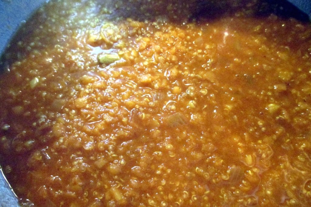 Mélange bien, ajoute un peu de sel et laisse cuire à feu doux, couvert, pendant encore 15-20 minutes, jusqu’à ce que les lentilles et le quinoa soient cuits. Si nécessaire, ajoute un peu d’eau.