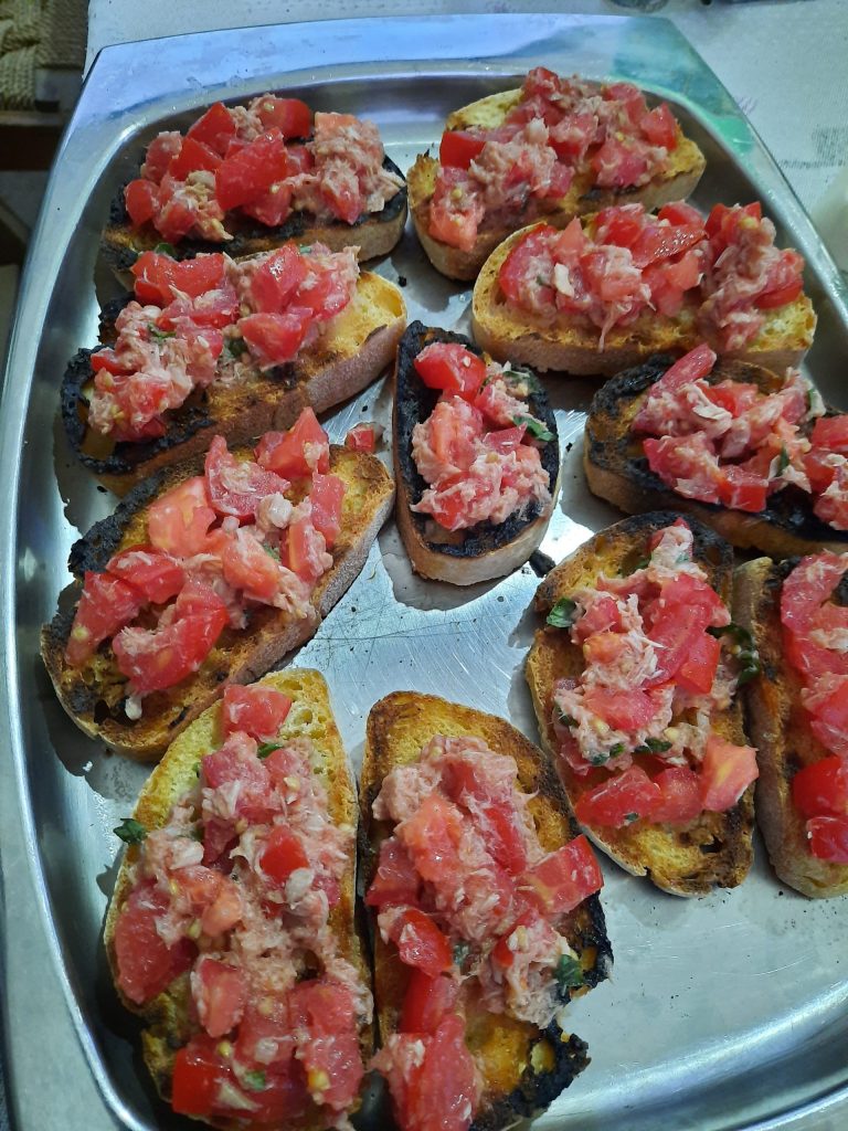 Les bruschette, pour moi, c’est avant tout du pain rassis grillé au feu de bois. Que ce soit hiver ou été, c’était mon plat préféré quand j’allais chez mes grands-parents. En été, elles étaient incontournables lors des barbecues, assaisonnées avec des tomates fraîches. En hiver, je les savourais avec du pâté d’olives noires et de la saucisse sèche, un vrai plaisir pour les papilles. En grandissant, j’ai expérimenté des versions avec des aubergines grillées à l’huile, du jambon cru, divers pâtés… mais pour moi, les bruschette sont bonnes même seules, avec juste un filet d’huile d’olive vierge extra. Aujourd’hui, cependant, je veux partager avec vous ma version estivale préférée : Tomate et thon.