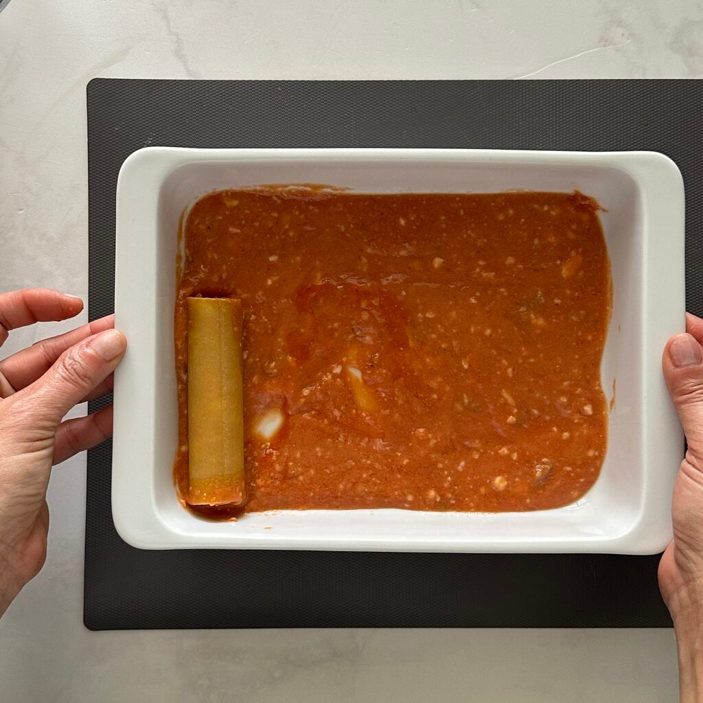 Une fois que vous aurez rempli tous les cannelloni et que vous les aurez disposés dans le plat,