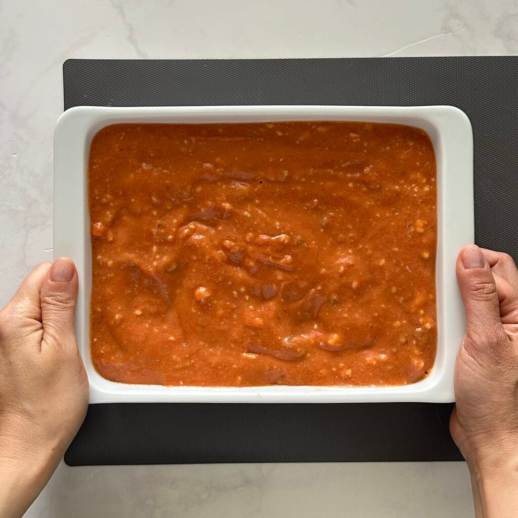 Versez un tiers du condiment de ragù et béchamel dans le plat.