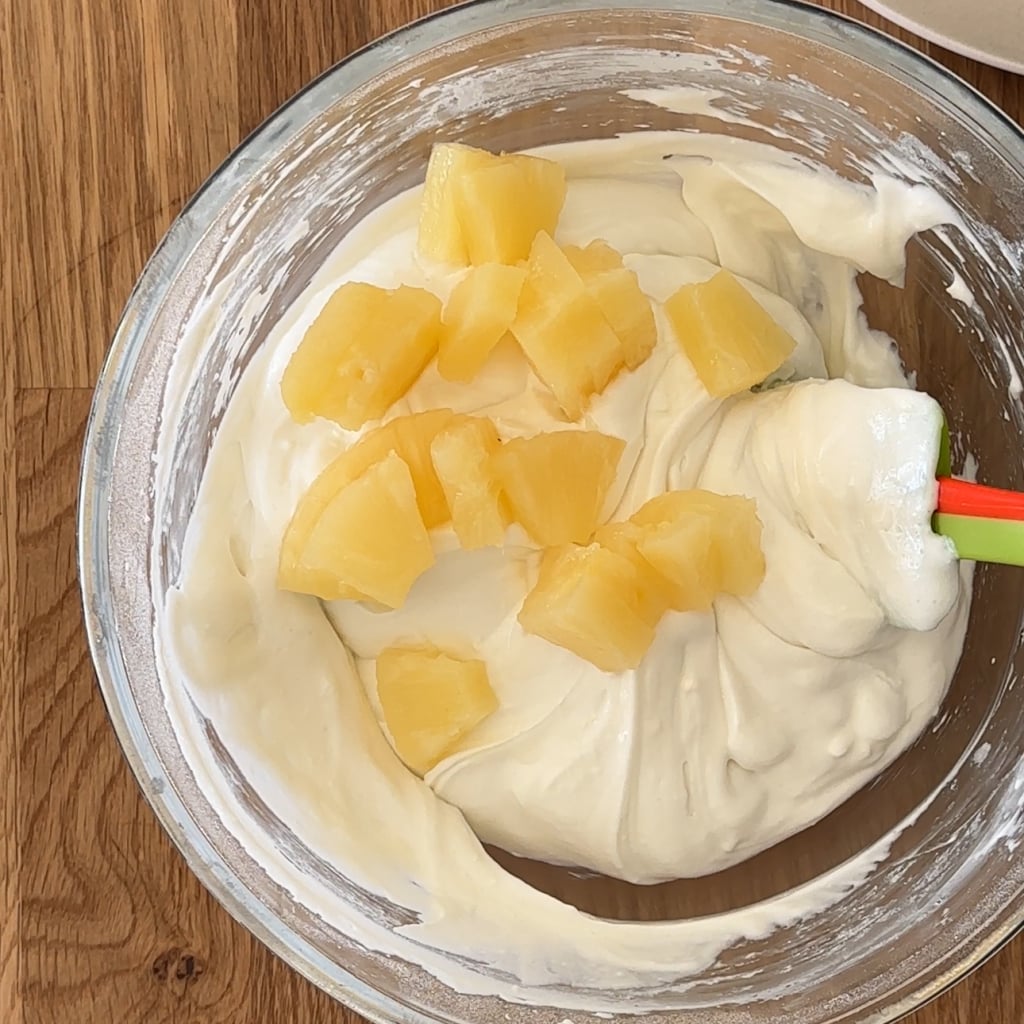 Portez à ébullition 50 ml de jus d’ananas, dans lequel vous aurez dissous l’agar-agar, en mélangeant bien. Ajoutez le mélange à la crème de yaourt et mélangez bien. Coupez en dés 2 tranches d’ananas et incorporez-les à la crème de yaourt, en effectuant toujours des mouvements du bas vers le haut.