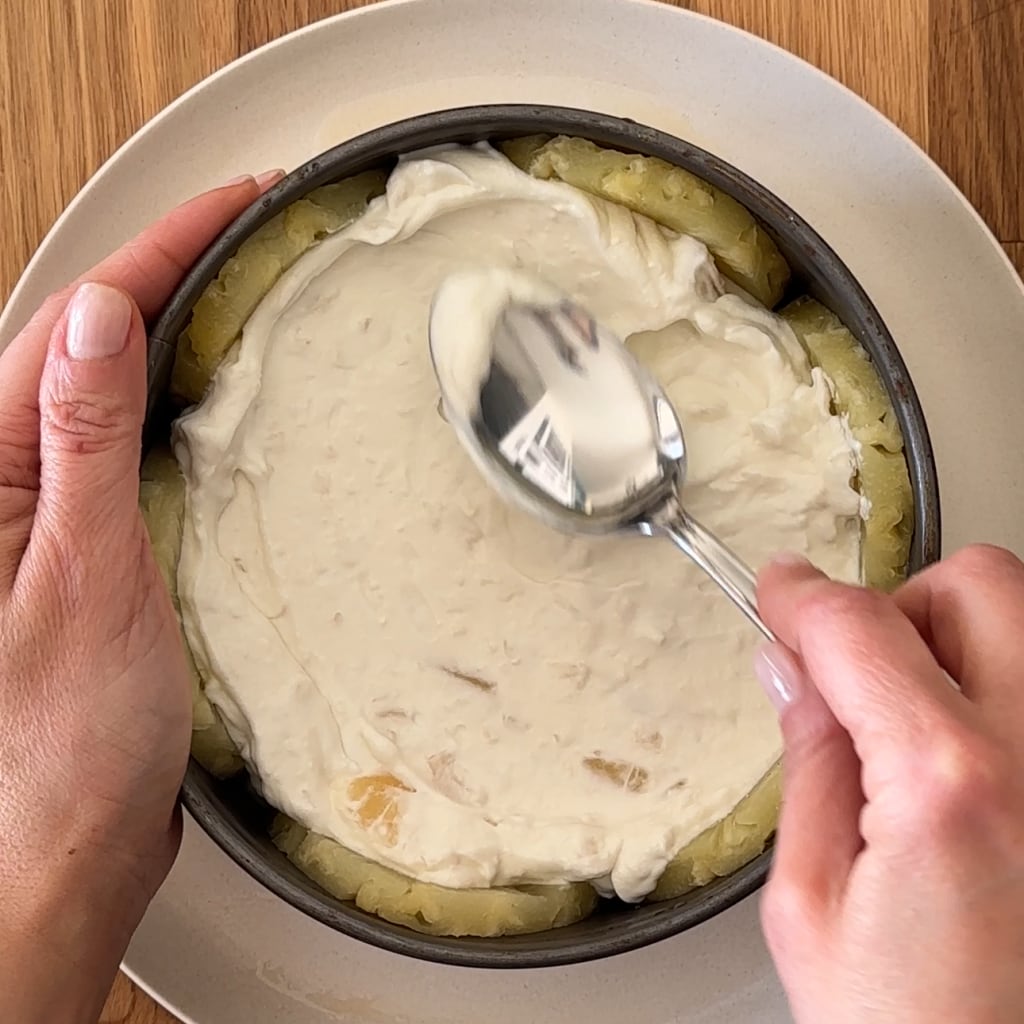 Décorez la surface avec les tranches d’ananas restantes, vous pouvez également les couper en petits morceaux et les répartir sur toute la surface. Couvrez le moule avec une assiette ou une feuille d’aluminium et mettez le gâteau à refroidir et à se raffermir au réfrigérateur, pendant 3-4 heures.