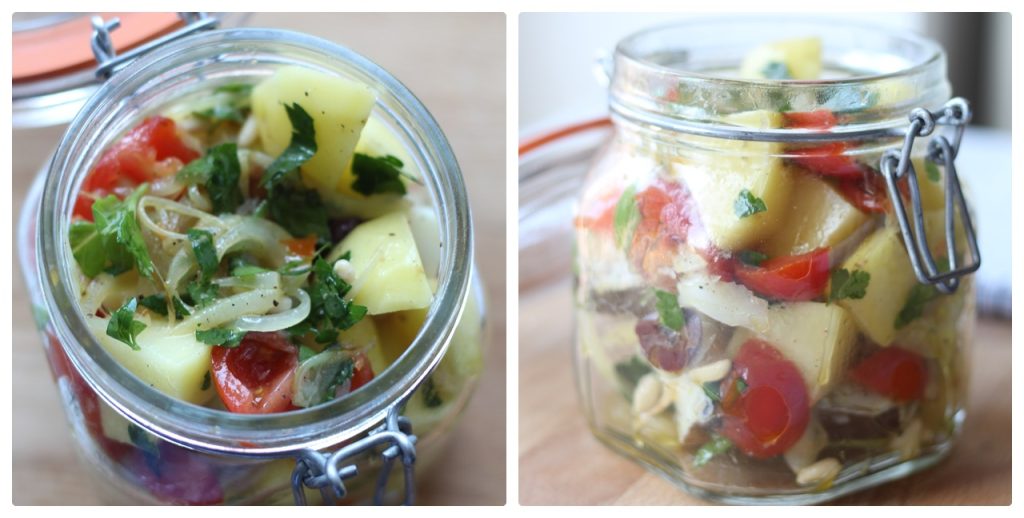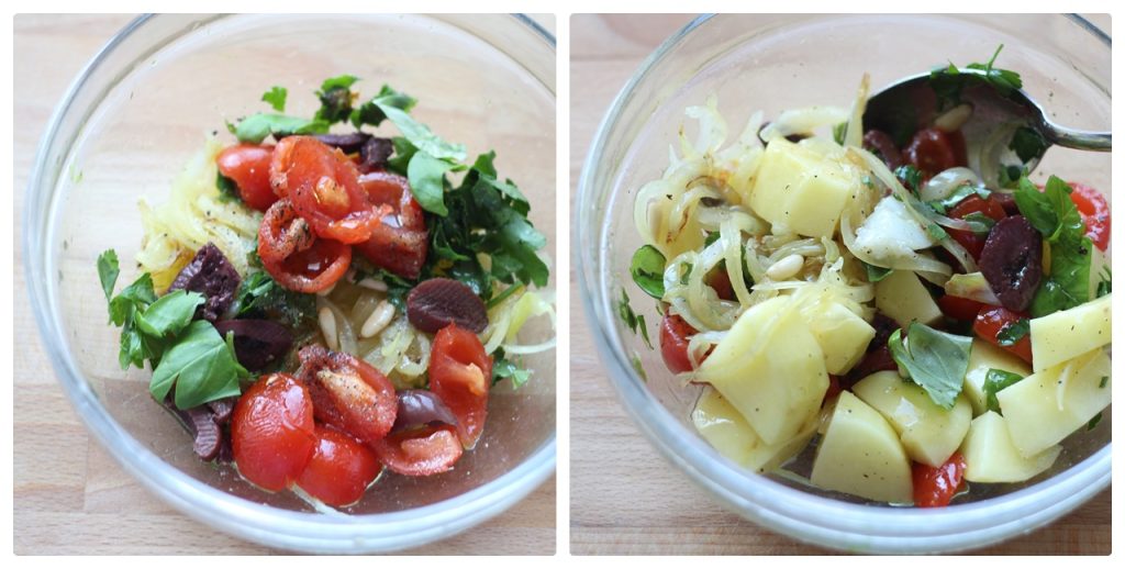 Chauffez une petite poêle et faites griller les pignons pendant environ une minute. Épluchez l’oignon et les pommes de terre. Lavez les tomates cerises et les herbes. Dans un bol, mettez l’oignon haché, assaisonnez avec l’huile et ajoutez les tomates cerises coupées en deux, les herbes hachées, les pignons, les olives et les pommes de terre coupées en dés. Salez, poivrez et mélangez bien pour assaisonner.