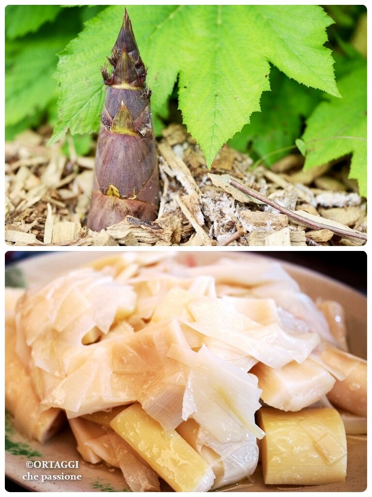 pousses fraîches de bambou, ont une écorce en couches, marron et coupante. De plus, elles contiennent des traces de toxines vénéneuses qui doivent être détruites par la cuisson, il est donc toujours nécessaire de les faire bouillir avant usage (au moins 15 minutes).