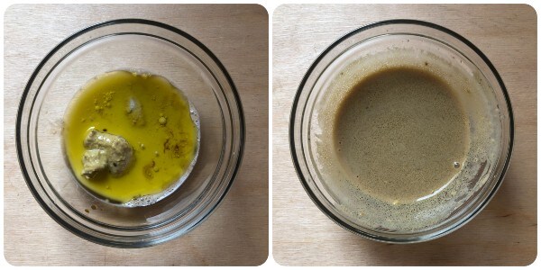 Dans une petite assiette, mettez une cuillère de moutarde (douce ou aromatique selon le goût personnel), une cuillère de vinaigre balsamique, une pincée de sel, trois cuillères de lait et trois cuillères d’huile et mélangez bien jusqu’à obtenir une sauce crémeuse et parfaitement émulsionnée.