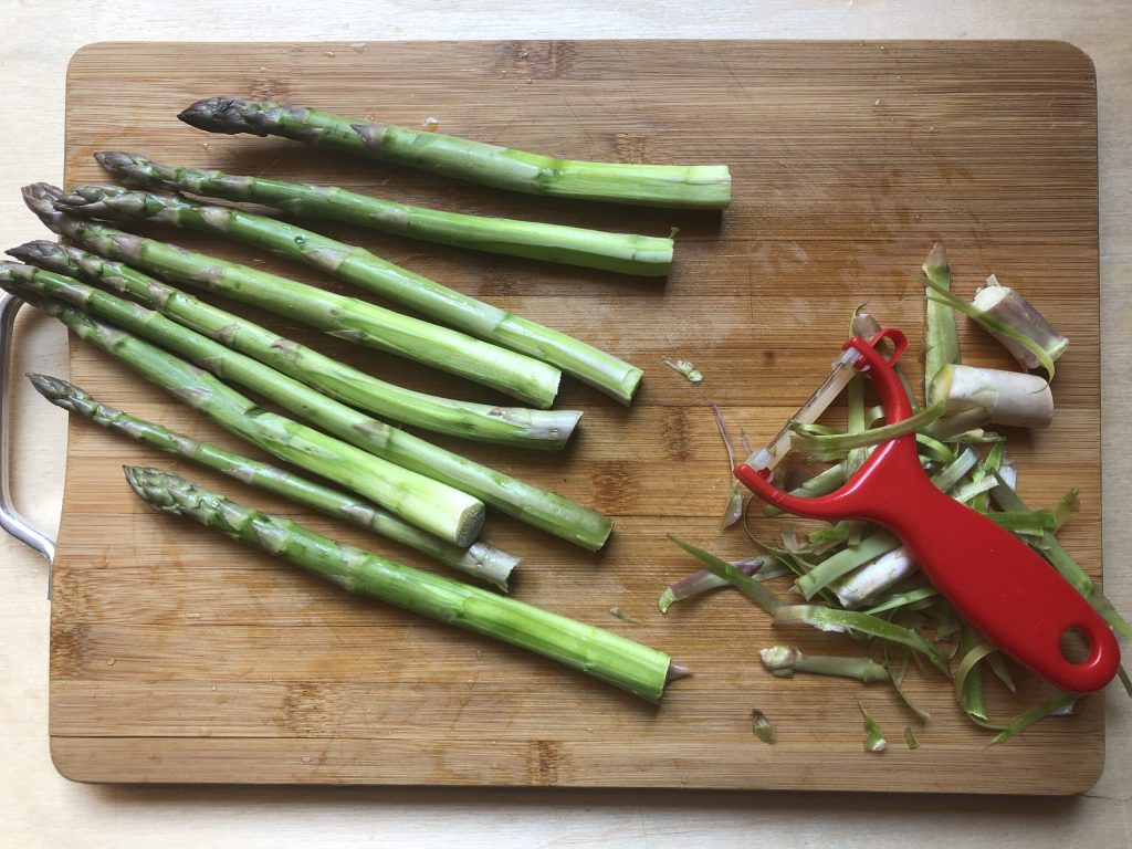 Laver les asperges, puis retirer la partie blanche et ligneuse et, avec un épluche-légumes, retirer également la partie basse de la tige, la plus filandreuse.