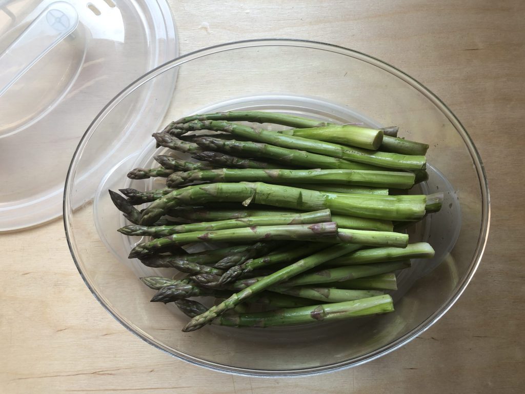 Une fois le temps de cuisson des asperges écoulé, les retirer du cuiseur vapeur et les sécher en les tamponnant avec du papier absorbant.