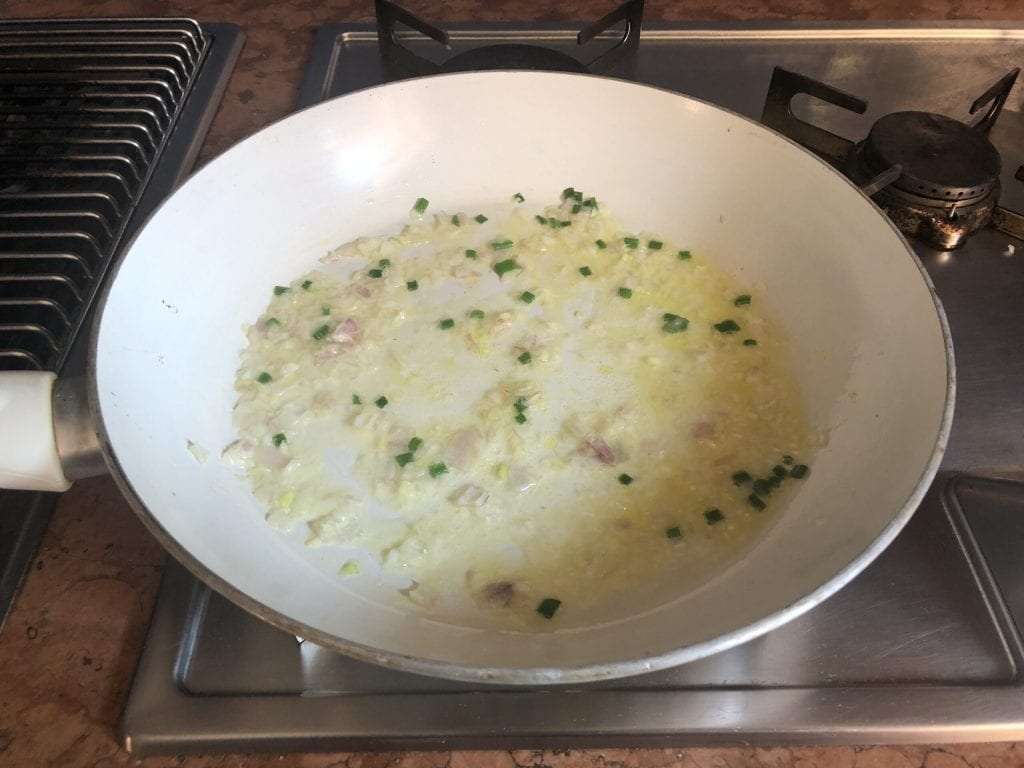 Dans une poêle, chauffer un filet d’huile avec un peu d’eau et y faire revenir l’oignon nouveau finement haché. J’ai aussi coupé quelques tiges vertes.
