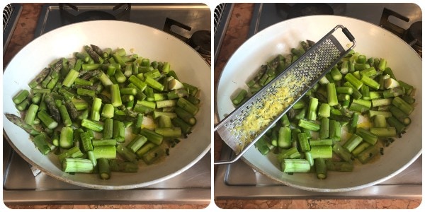 Laisser crépiter quelques instants, puis ajouter les asperges (pointes comprises) et assaisonner avec une généreuse pincée de sel et le zeste de citron râpé.
