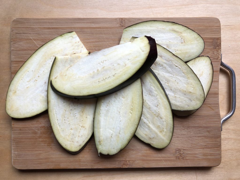 Équeuter l’aubergine, la laver, la sécher en la tamponnant avec du papier absorbant et la couper, dans le sens de la longueur, en tranches d’environ 8 mm d’épaisseur.