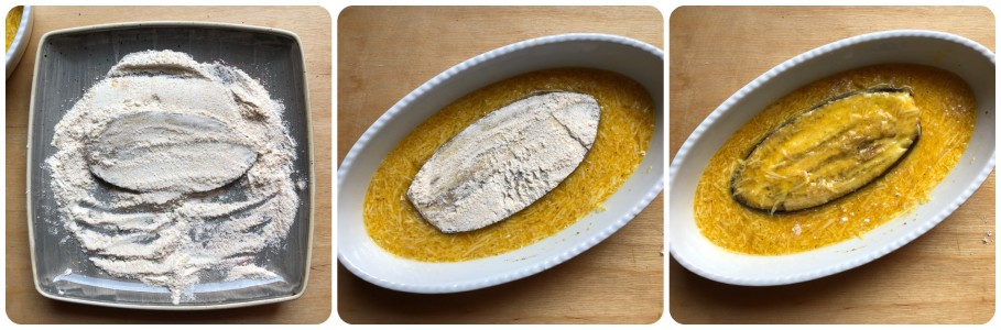 Lorsque les aubergines seront cuites, passer les tranches d’abord dans l’assiette avec les farines puis dans le mélange d’œufs et fromage.