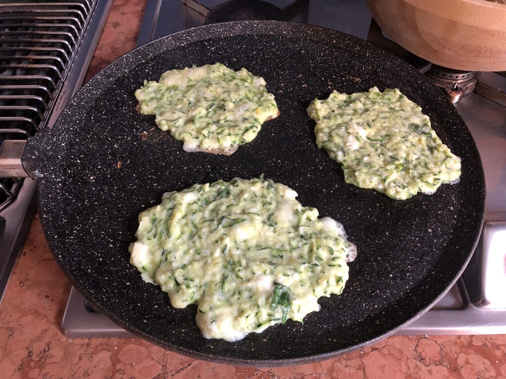 Cuire les beignets de courgettes et brie jusqu’à ce qu’ils soient bien dorés à la base, puis les retourner avec une pelle et les cuire de l’autre côté.