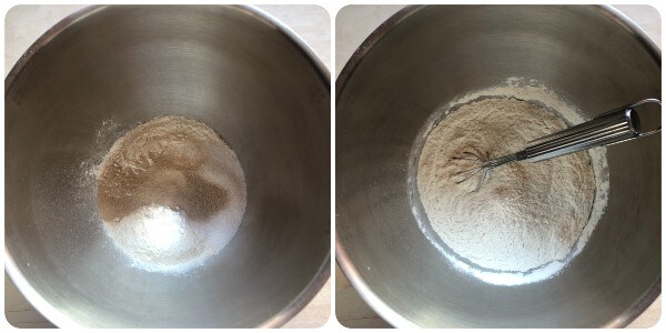Mettez dans le bol du robot pâtissier les deux farines, le sucre, la vanilline et la levure et mélangez avec un petit fouet manuel.