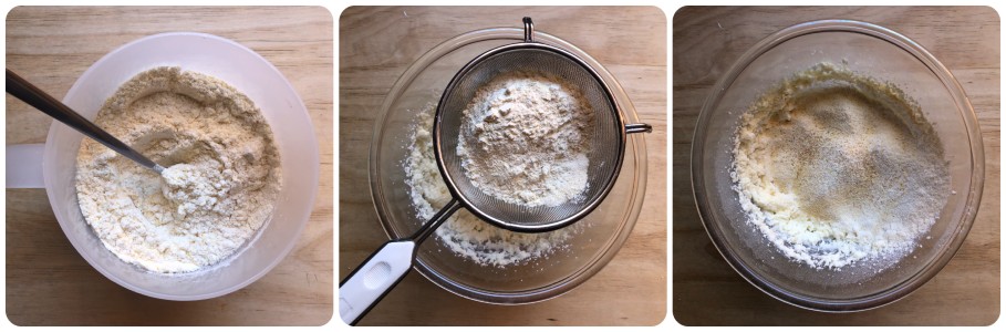 • Dans un petit bol, mélanger la farine blanche avec la farine de maïs, la fécule et la levure, puis les ajouter au beurre et au sucre en les tamisant à travers une passoire à mailles fines.