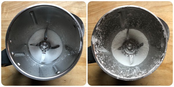 AVEC LE THERMOMIX: mettre dans le bol le sucre semoule et le pulvériser (7 sec. à vitesse Turbo). Si vous pétrissez à la main, utilisez directement du sucre glace au lieu de celui en semoule.