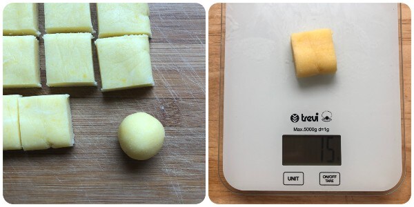 Après le temps de repos, transférer la pâte sur le plan de travail et en prélever des portions de 15 g chacune. Les faire rouler entre les paumes des mains pour former des petites boules. J’ai coupé le petit pain en petits carrés pour ma commodité; puis j’ai pesé chaque carré en le retaillant s’il était trop grand ou en ajoutant de la pâte quand il était trop petit. Bien sûr, vous pouvez procéder comme vous le souhaitez.
