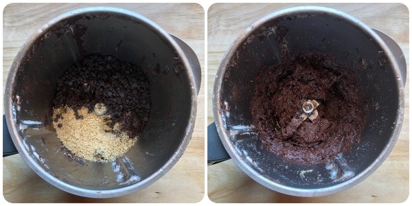 Enfin ajouter la farine de noisettes, les pépites de chocolat et les incorporer au mélange (15 sec, vitesse 4, sens inverse).