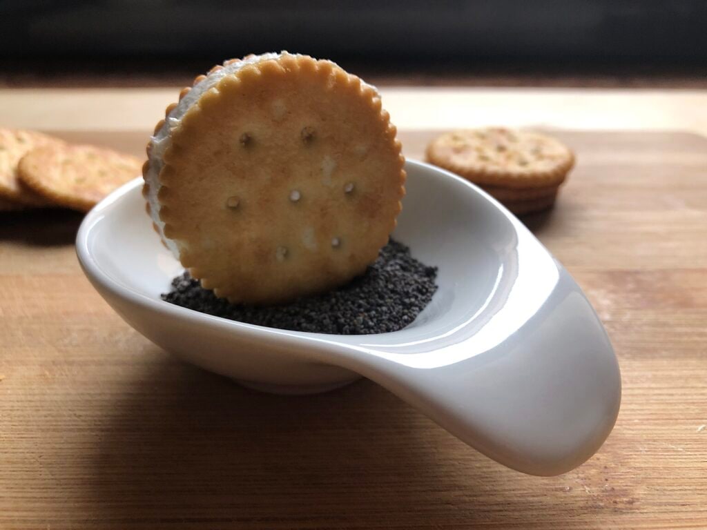 Étaler un peu de cette crème sur un cracker et le couvrir avec un second cracker pour former une sorte de petit sandwich.