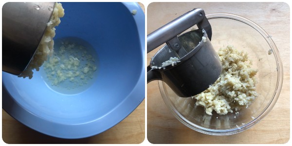 Puis écrasez-les délicatement avec le presse-purée pour faire sortir l’excès d’eau. Récupérez le liquide rendu, passez-le au travers d’une passoire pour récupérer d’éventuels résidus de chou-fleur et procédez à une seconde écrasée : il faut obtenir une consistance moelleuse mais pas une purée. Pour vous donner une idée : mon chou-fleur bien écrasé pesait 313 g.
